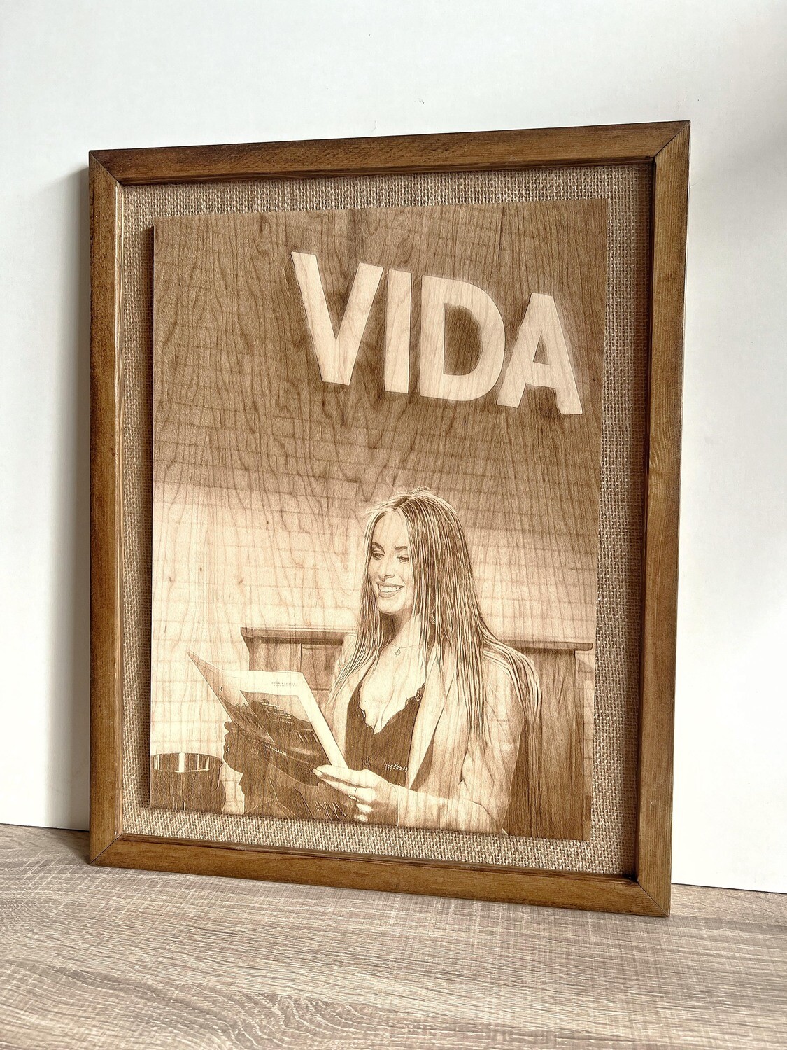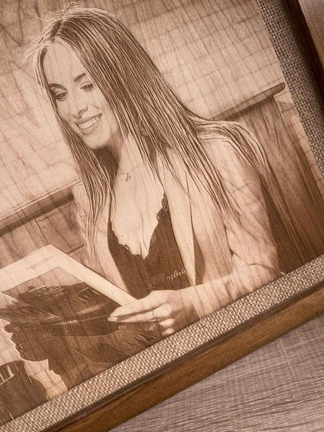 Tus fotografías favoritas quemadas en madera natural, personalizadas y con los acabados que prefieras. Marco de tela arpillera incluido.